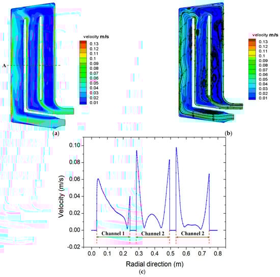 The flow velocity field is presented in Figure 7, in which the velocity magnitude is synthesized by x and y velocities. It shows that the velocity near the channel wall is relatively larger, and a considerable number of vortices emerge nearby. This is closely related to the geometry design, gravity effects, and radial distribution of heating power. Take Channel 1 for example, PbLi flows into a nozzle with a sudden enlargement that causes larger velocity at the bottom of the radial pipe, which induces vortices. When it turns into the poloidal channel, the velocity near the front wall becomes significantly larger due to the centrifugal force, and it reduces sharply along the radial direction yet increases again since there are vortices caused by the different velocity gradients in the same channel. In Channel 1 and 2, because the poloidal temperature difference is 130 °C, it brings about buoyancy lift due to the density difference. Therefore, vortices in the two channels show more complicated patterns. A vortex appears in the middle of the channel, which blocks the coolant flow, thus the velocity near the channel wall becomes larger. Furthermore, the velocity magnitude along the radial direction in Figure 7c shows that the mass flow in Channel 2 is smaller, which indicates that the natural convection dominates the flow field. This explains why the number of vortices in this channel is greater. It should be emphasized that vortices are to be avoided in liquid blankets because they may increase the momentum dissipation and further increase the pressure drop, which can reduce the power conversion efficiency.
