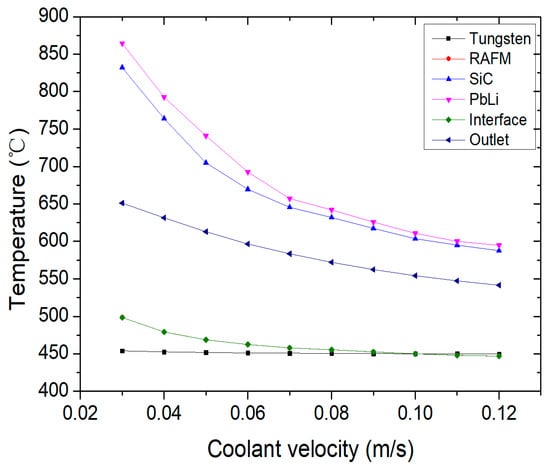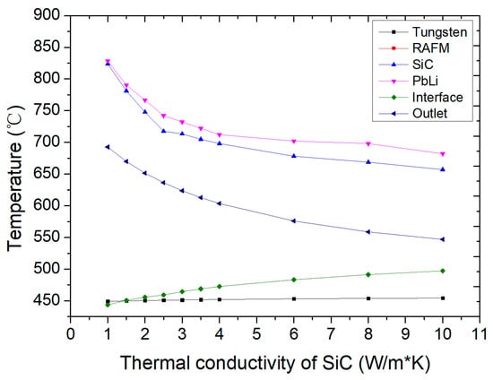 In this sensitivity analysis, the thermal conductivity of SiC ranges from 1.0 W/(m·K) to 10.0 W/(m·K), while the velocity of PbLi is kept constant. The variation of maximum temperature and coolant pressure drop for all materials is plotted in Figure 8 and Figure 9. As the TC of SiC increases, the insulation performance of SiC deteriorates, and this causes more heat losses from PbLi to the structure materials, i.e., tungsten and RAFM. Therefore, the temperature of PbLi and SiC was decreasing, as well as the outlet temperature, while the temperature of tungsten and RAFM changes in the opposite way. When TC increases from 1.0 W/(m·K) to 10.0 W/(m·K), the temperature of PbLi reduces by 120 °C. As mentioned above, the temperature of the FW on the breeder side is higher, and it decreases along the reversed radial direction. Therefore, the hotspot appears at the interface between PbLi and RAFM, thus there is no difference in peak temperatures between RAFM and the interface. The temperature rise for the RAFM steel is 60 °C, but it is only 5 °C for tungsten because the distance to PbLi is farther. The outlet temperature for TC of SiC at 4.0 W/(m·K) is 603 °C, and it will not satisfy the requirement (outlet T ≥ 600 °C) when the TC of SiC increases further.