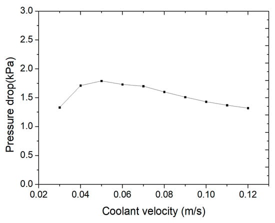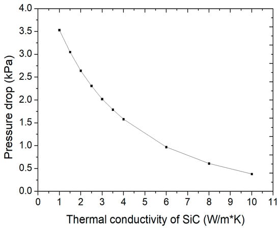 Keeping the coolant velocity constant, the pressure drop is also significantly affected by the TC of SiC, as it decreases by almost 90% when the TC increases from 1.0 W/(m·K) to 10.0 W/(m·K). This can be clarified from the contour of streamlines, as shown in Figure 10. As the temperature at the upper location becomes larger when TC decreases, the temperature difference term ΔT in Equation (2) becomes larger since the inlet temperature is the same. Thus, the buoyancy effects will be apparent and induce more vortexes. This will cause large momentum loss and pressure drop. However, the outlet temperature will be lower. And a compromise should be made among these design parameters.