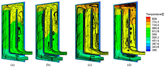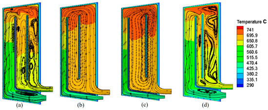 Temperature field combined with streamline (a) 1:1:1; (b) 0.5:1:1.5; (c) 0.5:1.5:1; (d)1:0.5:1.