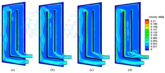 Contour of velocity magnitude for different thermal conductivity of SiC (a) 3.5 W/(m·K); (b) 2.5 W/(m·K); (c) 1.5W/(m·K); (d) 1.0 W/(m·K).