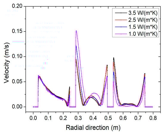 Radial distribution of velocity magnitude for different thermal conductivity of SiC.