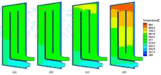 Temperature field under different coolant inlet velocity (a) 0.09 m/s; (b) 0.07 m/s; (c) 0.05 m/s; (d) 0.03 m/s.