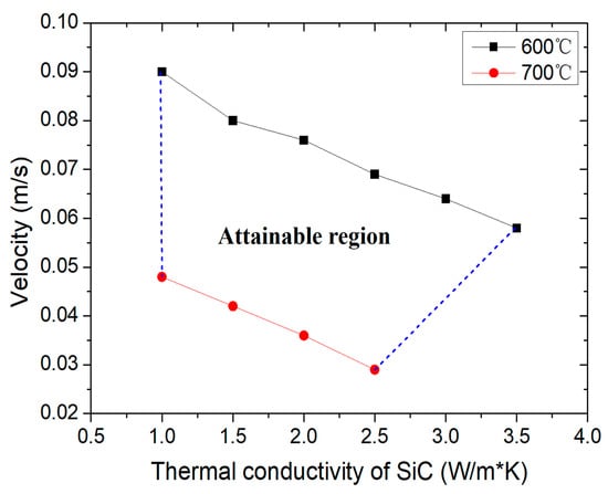 As mentioned above, the thermal conductivity and coolant inlet velocity have significant effects on the thermal hydraulic performance of the WLLC blanket. The design target of the outlet temperature is 600–700 °C in order to achieve high power conversion efficiency. These two parameters are adjusted and optimized simultaneously to obtain outlet temperatures of 600 °C and 700 °C, respectively. As shown in Figure 16, it indicates that the relationship between the velocity of PbLi flow and the TC of SiC is almost linear. Higher TC of SiC means poorer insulation performance. Thus, a lower velocity is needed to compensate and obtain a satisfactory outlet temperature. Besides, it shows that the design target of the outlet temperature cannot be achieved by adjusting only one parameter. For example, when the TC of SiC is greater than 3.5 W/(m·K), decreasing the inlet velocity is impossible to sustain outlet temperature ≥600 °C, and it needs to improve the insulation of SiC further. In all scenarios, the TC of SiC = 1.0–2.5 W/(m·K) can realize the outlet temperature of 700 °C. And when the target outlet temperature is 600 °C, the corresponding TC of SiC is 1.0–3.5 W/(m·K). Using the TC of SiC-velocity value pairs corresponding to the outlet temperature of 600 °C and 700 °C as boundary points, an “attainable region” is defined, where it is easy to find the possible combination of the PbLi velocity and TC of SiC to have outlet temperature within the target range. The results of these scenarios are summarized in Table 5, in which all the material temperatures can satisfy the requirements.