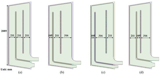 In the present design of the WLLC blanket, the PbLi flow channels are formed by the two CPs, and the channel width is equally spaced. The typical results (see Section 4.1) indicate that the hotspot would occur at the upper location due to the existing vortices (Figure 6), and this has a negative effect on increasing the outlet temperature. Therefore, the structure optimization is investigated by adjusting the width ratio of PbLi channels in order to change the flow field, then further optimize the temperature field. As shown in Figure 17, the total radial length remains the same, and the other three structures are designed on the basis of the standard model using three ratios, namely, 0.5:1:1.5, 0.5:1.5:1, and 1:0.5:1. Thermal hydraulic analyses are carried out for these optimization designs, and all the boundary conditions remain the same as in the typical case discussed in the previous sections.