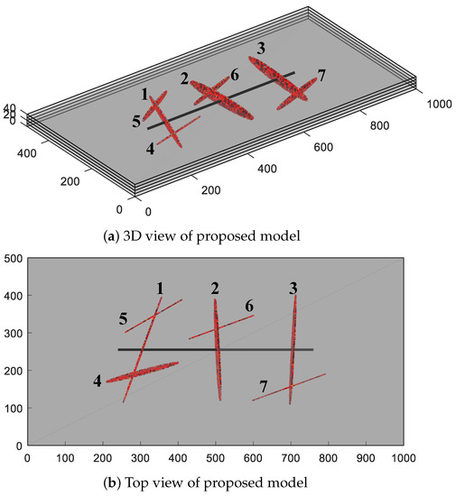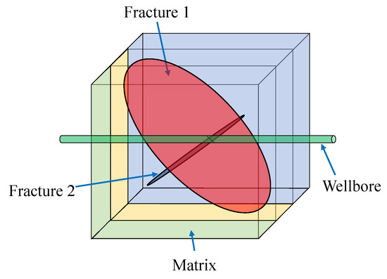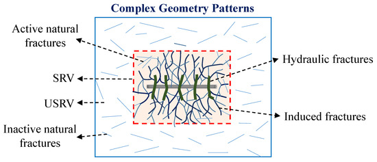 At present, a large number of numerical methods are adopted to simulate the CFNs of multi-stage fractured horizontal wells with SRV, among which the first commonly used is the multicontinuum model [8,9,10]. One of the most practical models in the multicontinuum methods is the dual-medium model. The concept of dual-porosity was firstly presented by Barenblatt et al. [11] and superimposed the two media of matrix and fracture. Warren and Root [12] established the classical dual-porosity model and created a concept of inter-porosity flow to characterize the matrix–fracture mass transfer process. Then, Pruess et al. [13,14,15] developed a multiple interacting continua model that included a series of matrix control volumes nested in fracture control volumes, which can effectively describe the multiphase fluids and heat transfer in fractured reservoirs. Compared with explicit discretization, the multiple interacting continua approach can distinctly reduce the additional grids generated by subgridding. However, the above methods miss the matrix–matrix correlation and cannot make clear the fluid exchange between matrix cells. Subsequently, a developed model named the dual-porosity dual-permeability (DPDK) was presented by Blaskovich et al. [16] and Hill et al. [17] and it added the flux between matrix grids. However, there are still problems that lead to unaccepted results in the existence of highly-localized anisotropy and preferential channeling [18]. Overall, the multicontinuum model, such as the DPDK, is too idealistic to recover the geometrical feature of large-scale hydraulic fractures when it is applied to practical engineering problems.
