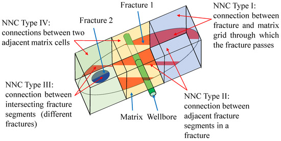 The conductivity calculation is an important step in the solution of fluid exchange capacity between adjacent grids when the EDFM is used to simulate macro-fractures. The expression contains three types of grid conductivity: matrix–matrix, matrix–fracture, and fracture–fracture. To determine the specific discrete format of control equations between fracture elements, the focus is to obtain the conductivity between fracture elements. The approximation of geometric factor in conductivity is associated with the connection relationship between matrix cell and fracture element. There are four types of non-neighboring connection (NNC) when dividing the fracture segments by matrix cell boundary (Moinfar et al. [24]; Rao et al. [36]; Du et al. [42]), which is illustrated in Figure 3. The significance of introducing NNC is to realize the mass transfer between adjacent grids in both theoretical and computational models. The transmissibility coefficient in NNC is calculated as follows [24]: