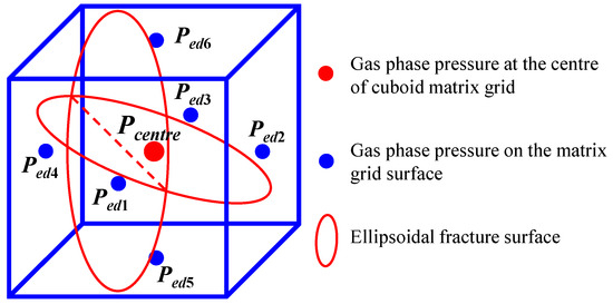 As noted above, the matrix–fracture fluid exchange process is characterized by the geometric index in the conductivity term. In previous EDFMs, many researchers adopt the Equation (9) to approximate the average normal distance which assumed that the pressure changes linearly in the normal direction to each fracture in a matrix gridblock (Li and Lee [23]; Moinfar et al. [24]; Hajibeygi et al. [43]). However, this assumption applies only to steady-state flow. Due to the huge difference between ultra-low matrix permeability and ultra-high fracture permeability, this linear steady assumption will lead to low calculation accuracy.