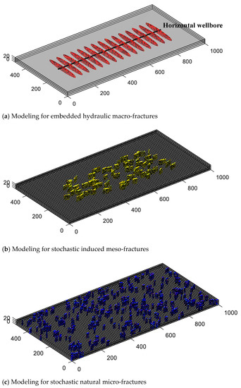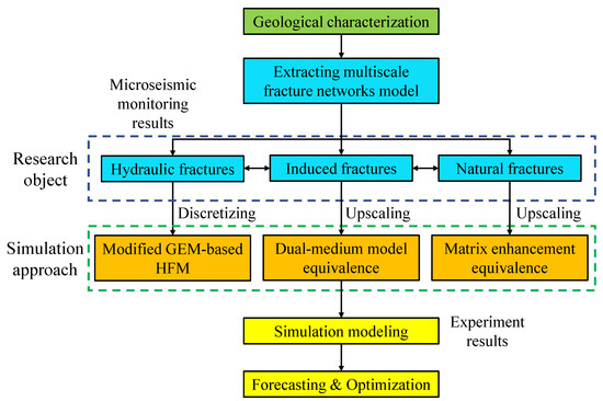 Due to the simultaneous existence of embedded discrete fractures, dual-medium equivalent fractures, and matrix equivalent fractures, the multi-scale fracture networks model essentially is a triple-porosity triple-permeability hybrid model containing the discrete fractures, the equivalent fractures, and enhanced matrix. The relationship between the research object (hydraulic fractures, induced fractures, and natural fractures) and the simulation approach is illustrated in an integrated workflow as Figure 5.