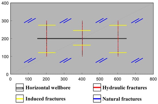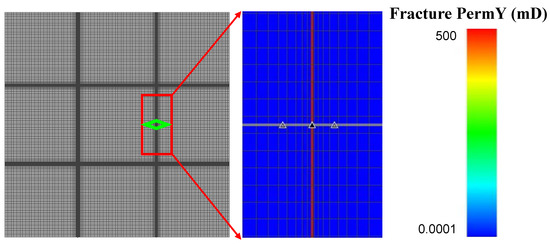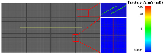 Generally, fractures can be classified into three scale levels: macro-scale, meso-scale, and micro-scale according to the aperture (flow conductivity) or length [32]. Hydraulic fractures can be regarded as macro-fractures because the permeability of hydraulic fractures is much larger than that of matrix domains, and it has a decisive effect on fluid flow. Generally, macro-fractures can be handled by EDFM because the morphology and flow behaviors of hydraulic fractures can be fully and explicitly characterized [33,34,35]. Induced fractures can be regarded as meso-scale fractures. When the number of fractures is small and the connectivity is poor, EDFM can also be used for fine simulation of induced fractures. However, when there is a large number of induced fractures that be connected to form fracture networks, the pretreatment process is unnecessarily complex and resulting in high computational cost [36]. In this condition, the efficient and stable dual-medium model can be used for equivalent simulation, and high simulation efficiency can be maintained with only a small part of accuracy loss [37]. The porosity and permeability of natural fractures are usually small and can be regarded as micro-fractures. Therefore, natural fracture properties can be directly equivalent to the matrix by the single-medium equivalent model, which effectively improves the computing efficiency.