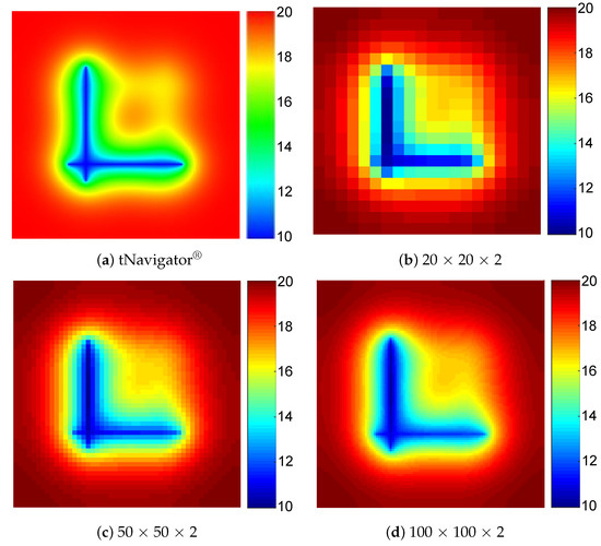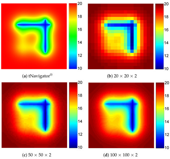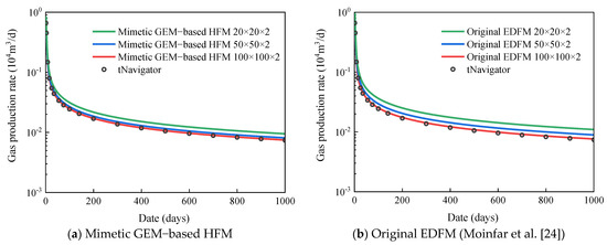 The accuracy of proposed three-dimensional embedded ellipsoidal macro-fracture model is compared with a commercial advanced reservoir-simulation software named tNavigator® developed by a group named rock flow dynamics (RFD), which has become the industry standard. The induced fractures and natural fractures are removed in this comparison. The purpose of the first example is to verify whether the proposed method can generate arbitrary-placed fractures in different layers to achieve 3D reservoir simulation. The fractures are vertical in this case because it is relatively difficult for commercial software to characterize the fractures with arbitrary dip angles. A fractured inclined-well modeled by proposed method and the 3D reservoir model with fracture elements and the inclined wellbore is shown in Figure 6. The reservoir dimensions are 200 × 200 × 20 m and have two layers. The different grid divisions, such as 20 × 20 × 2, 50 × 50 × 2, and 100 × 100 × 2, are used to test the mesh sensitivity of proposed model. Modeling parameters of reservoir and fluid are shown in Table 1. There are four fractures, of which No. 1 and No. 3 are in the top layer, and No. 2 and No. 4 are in the bottom layer. The fracture parameters in example 1 are shown in Table 2. The technology of local grid refinement (LGR) is used to describe the fractures and the schematic of the grid system with LGR for the commercial simulator tNavigator® is illustrated as Figure 7. The fractured inclined-well is producing at a constant BHP of 10 MPa and the simulation time for production is 1000 days. The comparison of pressure profiles for different layers between tNavigator® and our model on the 1000th day is illustrated in Figure 8 and Figure 9, and the computational results of the two models are very similar. Figure 10 shows the difference of the gas production rate of three simulators (tNavigator®, original EDFM, and mimetic GEM-based HFM) simulating over 1000 days, in which the effect of mesh sensitivity is tested in this comparison between the original model and modified model. The comparison of grid number and average relative errors are shown in Table 3. The result of simulators under this benchmark proves that the modified model has higher precision and higher robustness than previous EDFMs that adopt a linear steady assumption. The HFM based on mimetic GEM achieves an accurate calculate of matrix–fracture mass transfer. Consequently, the mesh convergence and accuracy of proposed method in this paper are validated when we take the solution of tNavigator® as the exact solution.