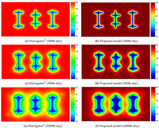 A staged-fractured horizontal well with a set of multi-scale CFNs is designed by proposed hybrid model as shown in Figure 13. The accuracy and stability of proposed model are compared and verified by commercial simulator tNavigator®. The reservoir dimensions are 800 × 400 × 10 m and only have one layer. The modeling parameters of the reservoir and fluid are the same as in Table 1. To saving the computing cost, all of the fractures are completely penetrating the reservoir and without any arbitrary dip angles. The fracture parameters are shown in Table 5 and the noticeable differences between different scale fractures are length, aperture, and azimuth degree. The multi-scale CFNs are modeled by tNavigator® and illustrated in Figure 14. In tNavigator®, the LGR method and DPDK model are used for modeling the hydraulic fractures and induced fractures separately, and the matrix enhancement equivalent approach is adopted for micro-scale fractures. In this case, the two models keep the same size of grid-block, but the number of fracture elements in tNavigator® is more than that in our model and this is caused by LGR. The production time is 1000 days under a constant BHP of 10 MPa. The comparison of pressure profiles for multi-scale CFNs in different periods is shown in Figure 15, the comparison of production dynamics calculated by two simulators over 1000 days is Figure 16, and the comparison of grid number and average relative errors for two simulators is Table 6. The simulation results showed a good agreement for pressure profiles, daily production curve, and the average reservoir pressure curve of two simulators on the 1000 days. The results within a reasonable error range indicate the high accuracy of the proposed hybrid model.