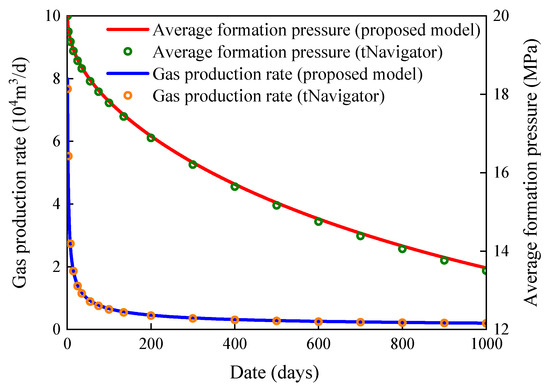 Figure 19 shows the simulation results of formation pressure and the gas production rate. At present, this studied fractured horizontal well in Sichuan has been in production for about six years. Comparing the production performance data calculated by proposed model with the field production data, it can be proved that the trend of productivity is highly consistent and the errors were acceptable. The above comparison results explain that the proposed model has high reliability. The development of shale gas reservoirs is dominated by fracture-controlled resources. Therefore, the permeability of each scale fracture is an important evaluation parameter, which directly influences the gas recovery.