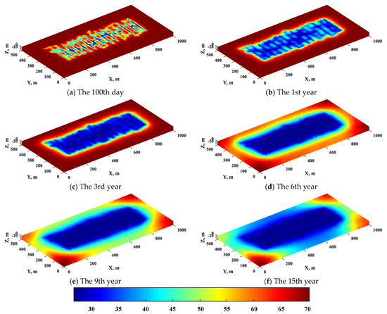 Modeling for multi-scale fractures is shown in Figure 17. Firstly, all hydraulic macro-fractures are assumed to be evenly distributed on the horizontal section. The basic model of 3D reservoirs with the embedded macro-fractures and the horizontal wellbore is modeled in Figure 17a. The induced fractures and natural micro-fractures are modeled with the multi-stochastical simulation method according to the actual situation of shale gas reservoirs. Their corresponding 3D spatial position coordinates are stochastically generated by the Monte Carlo method [47] and generated in the formation. The difference between them is that the induced fractures only exist in the SRV, while the natural fractures exist in whole reservoirs. The strike of these fractures is determined by multiple-point geostatistics and the trend of minimum horizontal principal stress is taken as an average value with a standard deviation is 20°. The total number of meso-scale induced fractures is 70 and its length is determined by Boolean random simulation with an average value of 35 m and the standard deviation of 10 m. Similarly, the total number of natural micro-fractures is 300 and its average value of length is 15m with a standard deviation of 5 m. The basic model of induced fractures is shown in Figure 17b. and the natural micro-fractures modeling is shown in Figure 17c. The next step is to find the matrix grid where the meso-scale and micro-scale fractures are located and treat them with their respective equivalent methods. Lastly, combining the three models in Figure 17a, Figure 17b and Figure 17c to obtain a coupled triple-porosity triple-permeability hybrid model for simulating the multiscale fracture networks. The reservoir pressure distribution map at the different years, in this case, is illustrated in Figure 18.
