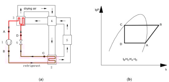 The closed heat pump drying system with waste heat recovery. (a) Schematic diagram (b) P-h diagram of heat pump cycle. 1. Compressor 2. Condenser 3. Evaporator 4. Sensible heat exchanger 5. Drying cabinet 6. Throttle valve. A. Compressor suction B. Compressor displacement C. Condenser outlet D. Throttle valve outlet.