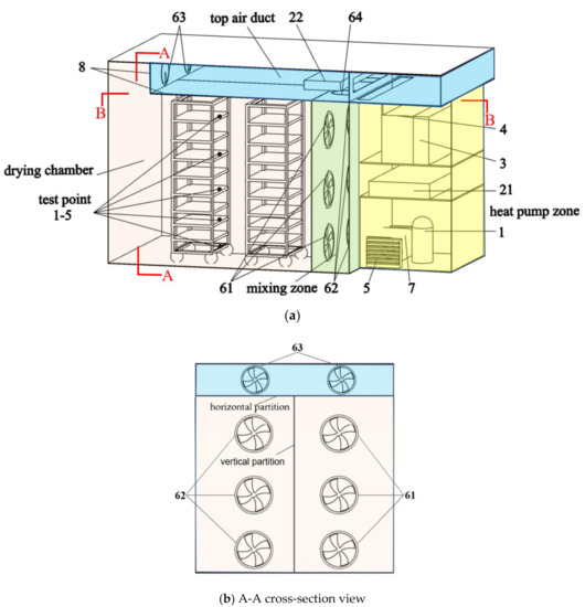 Figure 2 is the schematic diagram of the closed waste heat recovery type heat pump drying test rig. The drying box comprises four sections: drying cabinet, mixing zone, heat pump zone, and top air duct. The overall size of the drying box is 7300 mm (long) 2000 mm (wide) 2800 mm (high). A horizontal partition is installed at a distance of 550 mm from the top of the box. From left to right, the drying cabinet, the mixing zone, and the heat pump zone are below the partition and are 4900 mm, 900 mm, and 1500 mm in length, respectively. A vertical partition is installed in the middle of the drying cabinet to divide it into supply and return channels. Two groups of material pallets are placed on the two channels of the drying cabinet. The size of each pallet is 800 mm (long), 600 mm (wide), and 50 mm (high). There is a door on the left side of the drying box to load or unload the materials. An air channel is located between the door and the left ends of the horizontal and vertical partitions. A condenser is arranged in the top air duct above the mixing zone. The heat pump zone comprises the compressor, auxiliary condenser, evaporator, and sensible heat exchanger.