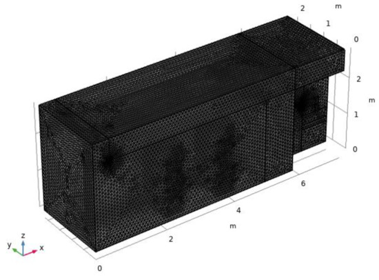 In modeling, coarse, standard, fine, and extremely fine meshes are calculated. The mean velocity results show that the deviations of standard, fine, and extremely fine meshes are within ±5%. Therefore, the following works are performed using standard meshes (Figure 3) to save computation time.