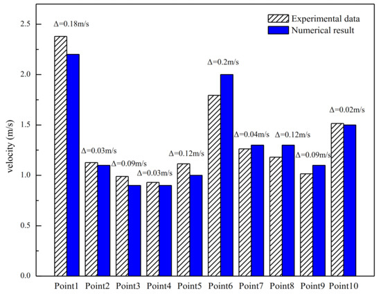 Ten hot wire anemometers (JY-GD2 type), with a measuring range of 0–15 m/s and accuracy of ±0.2 m/s, are arranged uniformly from top to bottom at the middle section of the supply and return channel in the drying cabinet to verify the model’s accuracy. The sensor probes are located in the middle of the adjacent pallets on the shelf with heights of 0.25 m, 0.65 m, 1.05 m, 1.45 m, and 1.85 m, respectively. The supply channel is numbered 1 to 5 from top to bottom, and the return side is numbered from 6 to 10. The data is recorded every 1 min during the test, and the test lasted for at least 30 min. The velocity values for each point during the steady test period were averaged and compared with the measured ones at each point, as shown in Figure 3.