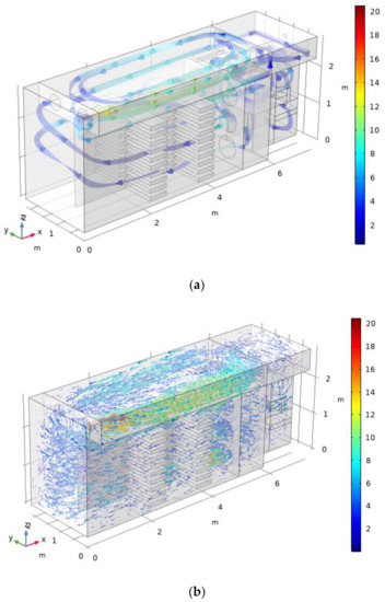 The simulated streamlines and flow fields of the closed heat pump drying system with waste heat recovery are shown in Figure 5. The active flow distribution of the closed-loop drying air is driven by the fans and works well. The air from the supply fan enters the circulation passage of the drying cabinet and the top duct. Then, it enters the condenser and the heat pump and finally returns to the mixing zone. The supply, return, bypass, centrifugal and circulation fans drive air flow in the drying system to make the closed-loop air circulation including the drying cabinet circulation passage, circulation heating passage, and heat pump air passage.