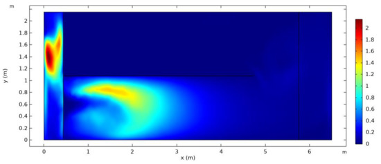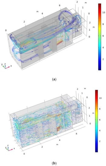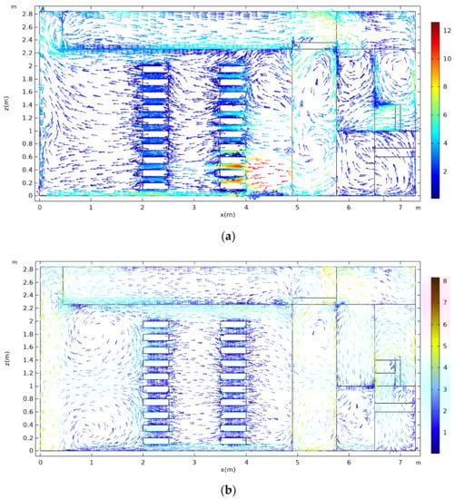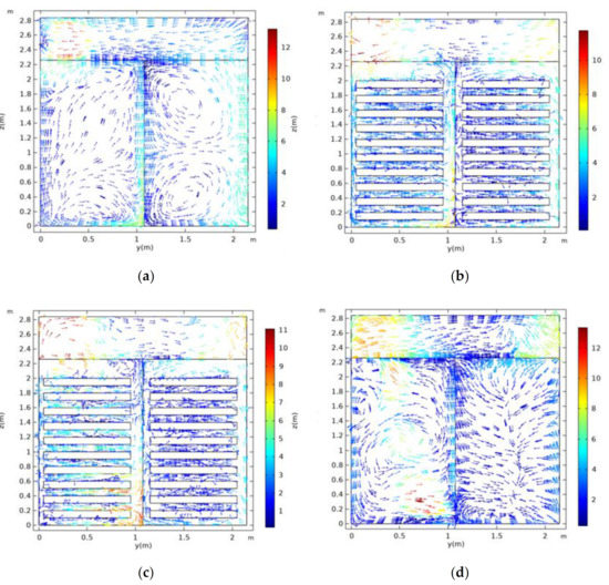 The velocity distribution in the drying cabinet, the top duct, mixing zone, and the heat pump can be obtained from Y planes. Figure 7a is a velocity profile on the y = 0.75 m plane in the supply channel. The velocity increases when the air flows between the adjacent pallets. The velocities in the passage between the pallets of different heights are different. The velocity in the lower layer is generally higher than that in the upper layer, and the velocity in the lower outlet of the supply fan is the highest (10–12 m/s). The velocity between the pallets of the shelf near the supply and return fan is larger than that far away from the fans. Figure 7b shows the velocity profile on the y = 1.35 m plane in the return channel. Eddy currents are present in the return channel in the x = 0.5–2 m region due to reduced static pressure at the inlet of the return passage. This reduction is caused by the bypass fan running in the top duct.