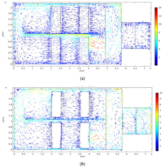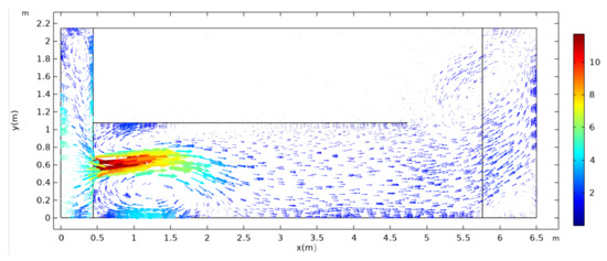 Figure 10 shows the simulated velocity distribution at the z = 2.55 m section for the P3 program. It can be seen that the installation of the partition panel in the top duct abates the vortex in Figure 8c, and the top flow field is improved.