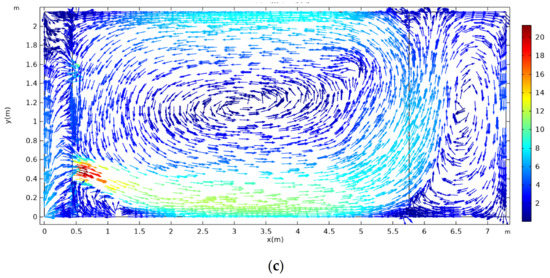 Figure 8a and b are velocity profiles on Z = 0.4 m and Z = 1.75 m planes in the drying cabinet, respectively. As can be seen that, the velocity range in the lower part of the drying cabinet (Z = 0.4 m) is higher than that in the upper part (Z = 1.75 m). It is observed that there is a vortex near the partition in the return channel. Figure 8c is a velocity field on a z = 2.25 m plane in the top loop. The velocity at the outlet of the bypass fan over the supply channel of the drying cabinet, with the maximum velocity up to 20 m/s, is higher than that over the return channel, which causes uneven velocity distribution and produces a vortex. Because the supply and return fans in the drying cabinet are two-way fans, the circulation direction conversion of the air in the drying box can be realized. When the return fans reverse flow and function as the supply fans, and the supply fans reverse flow and function as the return fans, the outlet velocity of the upper bypass fan in the top duct will be higher than that of the lower fan, and the vortex will also appear.