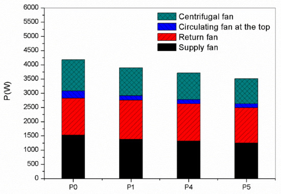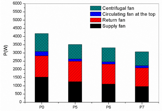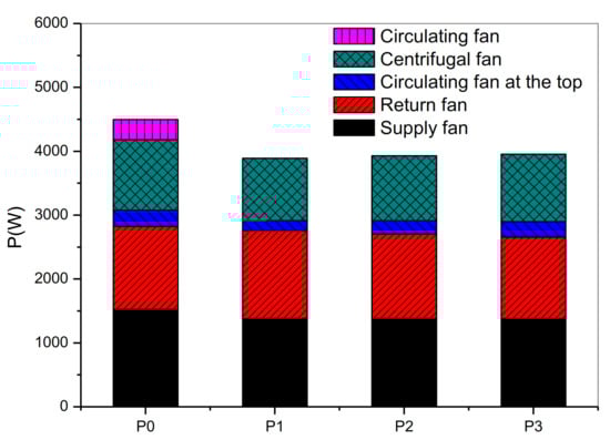 As shown in Figure 14, the power consumption of the supply fans in the P1–P3 programs is slightly reduced compared to the P0 program. Only one bypass fan runs with reduced volume flow, and circulating fans are removed so that the total energy consumption of the fans in the P1–P3 program is 13.4%, 12.6%, and 12.0% lower than the P0 program, respectively. Subsequently, the total energy consumption of fans is obviously reduced. This conclusion is consistent with a study by Nwakuba et al. [33], which found that as aerodynamic devices consume more energy, the drying energy consumption increases with increased air velocity.