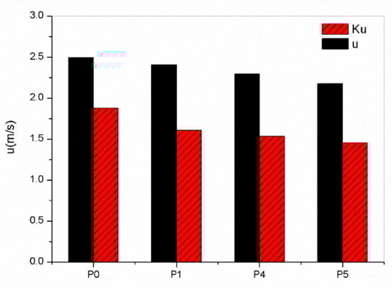 Figure 14 and Figure 15 show the average velocity and the velocity uniformity coefficient in the drying cabinet and the energy consumption of the fans after the volume flows of the supply fans are changed, respectively. It can be seen that the average velocity in the drying cabinet is 4.6% and 9.5% lower than that in the P1 program. The velocity uniformity coefficient is reduced from 1.61 to 1.53 and 1.45 for 63000 m3/h and 6000 m3/h of supply volume flow, respectively. It shows that reducing the volume flow of the supply fan can reduce the velocity in the drying cabinet but improves uniformity. As shown in Figure 15, the total energy consumption of fans in the P4–P5 program is 4.7% and 9.8% lower than that in the P1 program because the power consumption of fans decreases with the decrease in volume flow.