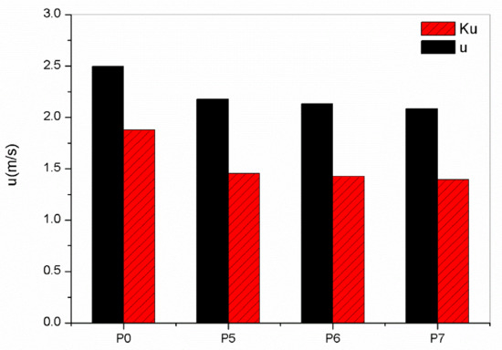 In the active flow distribution system, the series-parallel connected fans drive the air circulating in the system. The change of total pressure will affect the velocity distribution in the drying system and further affect the energy consumption. Figure 16 and Figure 17 show the average velocity and the uniformity coefficient in the drying cabinet and the fans’ energy consumption after changing the fans’ total pressures. The total pressure of each fan in the P6 and P7 programs is 10% and 20% lower than that in the P5 program. The average velocity in the drying cabinet decreases from 2.2 m/s to 2.1 m/s (−1.9%) and 2.0 m/s (−4.2%), while the uniformity coefficient decreased from 1.45 to 1.42 and 1.43. The results show that the velocity in the drying cabinet decreases slightly, and the uniformity becomes better when the total pressure of the fan is reduced. As shown in Figure 17, the total energy consumption of fans in the P6–P7 program is 5.4% and 12.6% lower than that in the P5 program, respectively. This reduction is due to the lower energy consumption of each fan. It proves that the total fan energy consumption decreases with the reduction in the total pressure of the fans.