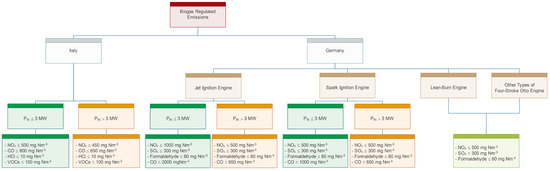 As an example, Figure 1 shows the regulations of Italy [15] and Germany [16,17] for emissions from biogas engines.