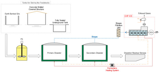 Focusing on biogas utilization, in the developing counties, it is combusted on-site in boilers for heating purposes, while in Europe and the USA, biogas is purified and directly burned in combined heat and power internal combustion engines (CHP-ICEs) to generate electrical energy and heat [2,3,4,5,6,7]. Therefore, considering the feedstocks’ widespread availability, the versatility of its use and the stability and programmability of both heat and electricity production, biogas fuel constitutes a great opportunity for countries that want to (i) reduce fossil fuel dependency, (ii) cut down greenhouse gas emissions, (iii) fight climate change, (iv) enhance the energy content of agricultural, industrial and municipal organic waste and residues, (v) shrink the quantity of household and similar waste sent to landfill, (vi) develop local markets, (vii) spread the distributed generation concept and (viii) encourage sustainable energy communities.