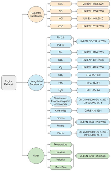 The experimental campaign devoted to detecting both regulated and unregulated compounds was conducted following the standards listed in Figure 3. The experimental campaign, as discussed in [24,25], was conducted in collaboration with a specialised laboratory. This collaboration guaranteed that the performed measurements had an uncertainty at the 95% confidence level.