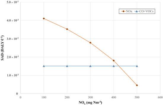 - The SAD of the denitrification system and the SAD of the oxidizing catalytic converter had the same order of magnitude, while the hourly damage of the NOx emissions was 43-times that of the CO+VOCs emissions. In a nutshell, the cost of the device had a great weight in determining the value of the SAD: the low cost of the system for CO+VOCs raised its SAD almost to the level of the NOx one;