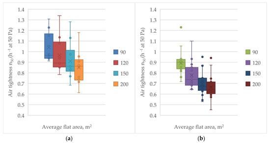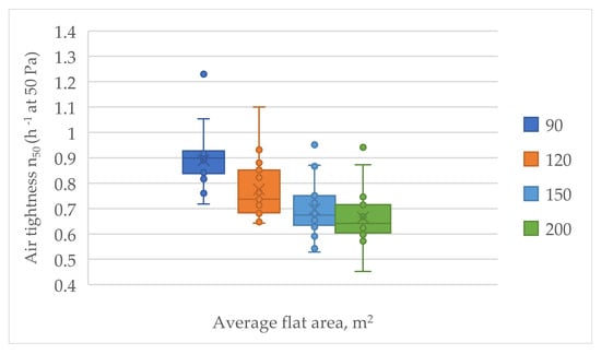 | Construction Type | Flat Location | Average Flat Area, m2 | Max of Airtightness n50 (h−1 at 50 Pa) | Min of Airtightness n50 (h−1 at 50 Pa) | Average Value of Airtightness n50 (h−1 at 50 Pa) |