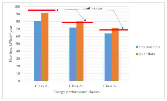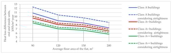 | Average Floor Areas of the Flats, m2 | Energy Class | Average Values of the End Units, Qsum (kWh/m2·year) | Average Values of the Inside Units, Qsum (kWh/m2·year) | Difference, Qsum diferent (kWh/m2·year) | Difference, % |