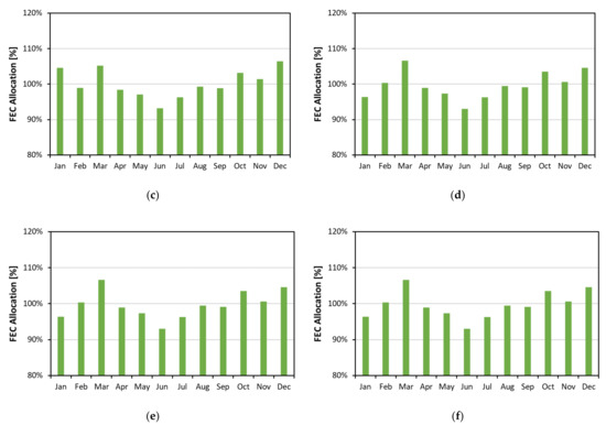 Figure 7. ERM default allocation factor for the years: (a) 2014; (b) 2015; (c) 2016; (d) 2017; (e) 2018; and (f) 2019.