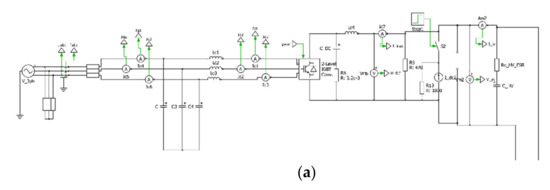 Finally, in order to obtain and analyze a complete system, the AC/DC and DC/DC converter models were integrated in one simulation model created in the PLECS environment. The block scheme of the model is shown in Figure 9.