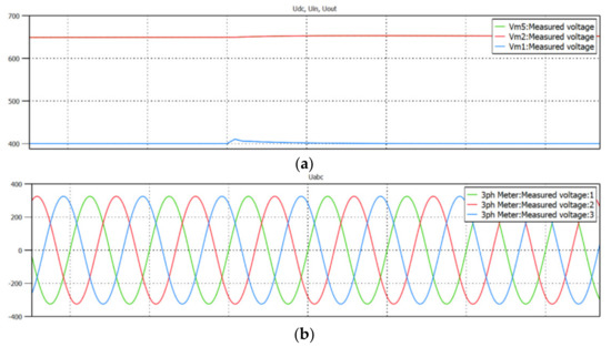 Simulation result—step load changes of AC/DC converter, from 85 kW of active power consumed from the grid, through 85 kW of active power restored to the grid, up to 85 kW consumed from the grid: (a) grid voltages; (b) grid currents; (c) DC-link current; (d) DC-link voltage.