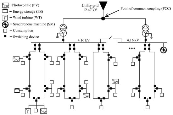 An example of a real-life microgrid that represents a university campus in the USA is depicted in Figure 1 [23].