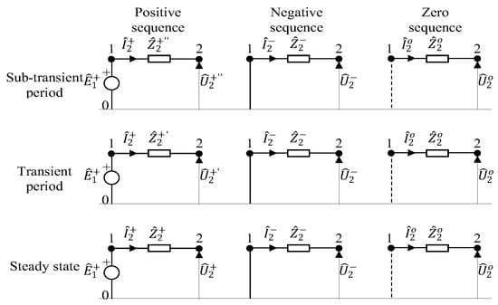 Synchronous machines’ models for fault calculations were well-known and established decades ago. In general, these models consist of ideal voltage sources behind (sub-transient, transient, or steady-state) impedances with the fact that in negative and zero sequence, the ideal voltage source is annulled as it is depicted in Figure 2.