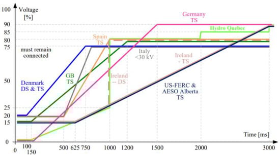 In Figure 3, the FRT requirements of grid codes for various countries are shown [9]. Different countries are marked with different colors. Time (in milliseconds) for how long an IBDER should stay connected to the grid in case of a fault is given on the X-axis, while the voltage at the IBDER’s connections (relative to the rated voltage) during the fault is given on the Y-axis.