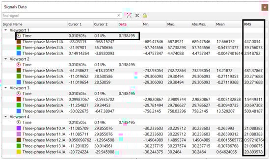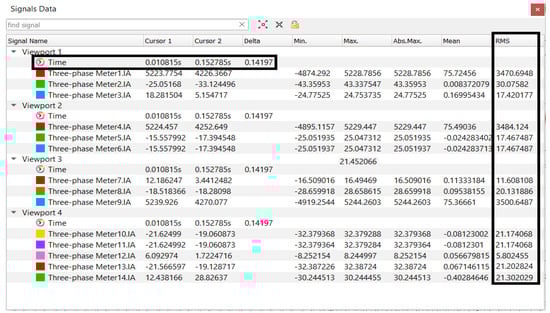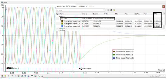 An example of the fault current response of the IBDER connected to the bus 14, which describes its behavior in case of a 3LG short-circuit at the bus 9, obtained with Typhoon HIL in time-domain, observed only in transient period is depicted in Figure 7. Values from the Signal Data window which is presented in a row named Time and columns named Cursor 1, Cursor 2 and Delta describe which time period is analyzed. As it can be seen from Figure 7, after a short initial sub-transient period (approximately 0.03s), which is beyond the scope of this paper, the IBDER contributes with a fault current of 21.3 [A] (RMS value) through branch 14 to the fault current. As it is presented in Table 2, value of the pre-fault current through branch 14 was 13.83 [A], thus the value obtained with Typhoon HIL setup proves that IBDER’s current during the fault is indeed limited to 1.5 times its rated value.