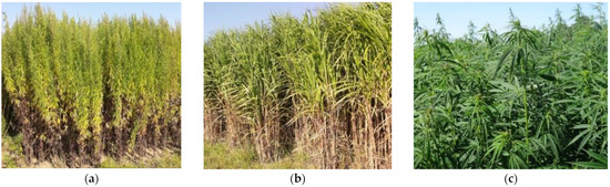 Coarse-energy crops: Artemisia dubia Wall. (a), Miscanthus×giganteus (b), Cannabis sativa L. (c).