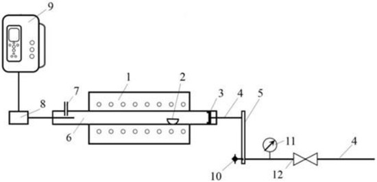 Schematic diagram of biomass thermal conversion and smoke emission test bench: 1, tubular heating furnace; 2, crucible with a sample of combusted biomass; 3, sealing plug; 4, air supply hose; 5, air flow meter; 6, combustion chamber; 7, chimney; 8, smoke extractor; 9, smoke analyzer; 10, air flow control valve; 11, manometer; 12, valve.