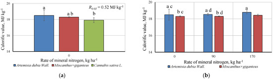The dependence of the calorific value of above-ground crops of Artemisia dubia Wall., Miscanthus × giganteus and Cannabis sativa L. not fertilized (a), on mineral nitrogen fertilization (b) (R0.05(A. dubia) = 0.55 MJ kg−1, R0.05(M. giganteus) = 0.12 MJ kg−1, R0.05(A. dubia × M. giganteus) = 0.12 MJ kg−1. a, b, c, d, there are no statistically significant differences (p < 0.05) between the columns marked with the same letter, as assessed using the least significant difference.