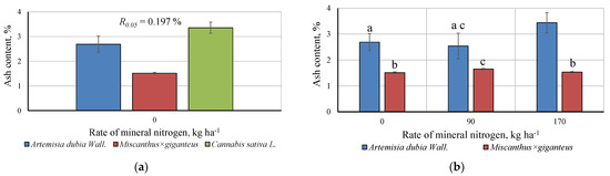 The dependence of ash content of above-ground crops parts of Artemisia dubia Wall., Miscanthus×giganteus and Cannabis sativa L. not fertilized (a), on mineral nitrogen fertilization (b) (R0.05(A. dubia) = 0.152%, R0.05(M. giganteus) = 0.043%, R0.05(A. dubia × M. giganteus) = 0.089%. a, b, c, there are no statistically significant differences (p < 0.05) between the columns marked with the same letter, as assessed using the least significant difference.
