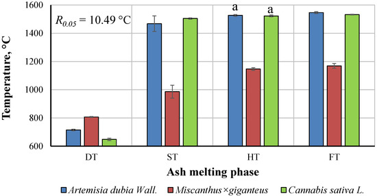 Ash melting temperature of Artemisia dubia Wall., Miscanthus×giganteus and Cannabis sativa L. not fertilized: DT, deformation temperature; ST, softening temperature; HT, hemispherical temperature; FT, flow temperature; a, there are no statistically significant differences (p < 0.05) between the columns marked with the same letter, as assessed using the least significant difference.