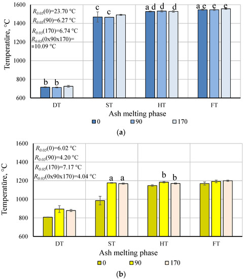 Figure 6 shows the melting temperature characteristics of A. dubia ash (a) and M. giganteus (b) ash, taking into account non-fertilization and fertilization of crops with mineral nitrogen 90 and 170 kg ha−1 rate. The DT characteristic of not fertilized A. dubia ash was recorded at 715 ± 5 °C, i.e., 1.13 times lower than M. giganteus. Fertilization with mineral nitrogen had a more significant effect on M. giganteus: fertilization with a 90 kg ha−1 rate may delay the DT characteristics by 88 °C, or 72 °C for the 170 kg ha−1 rate. In the case of A. dubia, fertilization with the highest mineral nitrogen rate delays the DT characteristic only by 10 °C, compared to the unfertilized variant.
