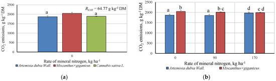 The dependence of CO2 emissions of Artemisia dubia Wall., Miscanthus×giganteus and Cannabis sativa L. not fertilized (a), on mineral nitrogen fertilization (b) (R0.05(A. dubia) = 73.56 g kg−1 DM, R0.05(M. giganteus) = 53.09 g kg−1 DM, R0.05(A. dubia × M. giganteus) = 50.83 g kg−1 DM. a, b, c, d, there are no statistically significant differences (p < 0.05) between the columns marked with the same letter, as assessed using the least significant difference.
