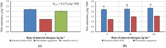 The dependence of NOx emissions of Artemisia dubia Wall., Miscanthus×giganteus and Cannabis sativa L. not fertilized (a), on mineral nitrogen fertilization (b) (R0.05(A. dubia) = 0.281 g kg−1 DM, R0.05(M. giganteus) = 0.053 g kg−1 DM, R0.05(A. dubia × M. giganteus) = 0.160 g kg−1 DM. a, there are no statistically significant differences (p < 0.05) between the columns marked with the same letter, as assessed using the least significant difference.